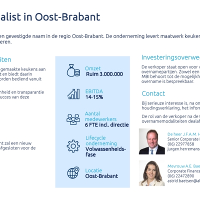 De onderneming biedt op maat gemaakte keukens aan in het midden tot hoge segment en biedt daarin optimale flexibiliteit. Klanten worden bediend vanuit één vestiging in Oost-Brabant. De reden van verkoop is dat de ondernemers het rustiger aan willen gaan doen. De verkoop van de onderneming zal plaatsvinden middels een aandelentransactie.