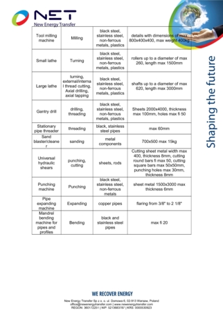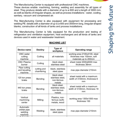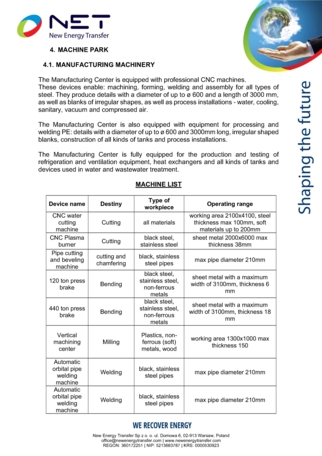 Het onderwerp van de verkoop is een productiefabriek die volledig is uitgerust met professionele CNC-machines. Deze apparaten maken het volgende mogelijk: bewerking, kunststofbewerking, lassen en assemblage van alle soorten staal. De machines produceren onderdelen met een diameter tot ø 600 en een lengte van 3000 mm, evenals onregelmatig gevormde uitsparingen, en procesinstallaties voor water, koeling, hydrauliek, sanitaire voorzieningen, vacuüm en perslucht. De fabriek beschikt ook over apparatuur voor het verwerken en lassen van PE: onderdelen met een diameter tot ø600 en een lengte van 3000 mm, onregelmatig gevormd uitsparingen, constructie van alle soorten tanks en procesinstallaties. De productiefabriek is volledig uitgerust voor de productie en het testen van koel- en ventilatieapparatuur, warmtewisselaars en alle soorten tanks en apparatuur die worden gebruikt bij de water- en afvalwaterzuivering.