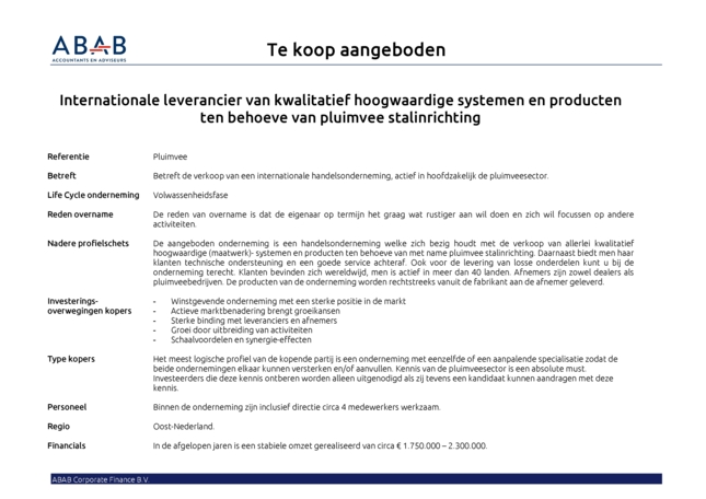 Ter overmame aangeboden: Internationale leverancier van kwalitatief hoogwaardige systemen en producten ten behoeve van pluimvee stalinrichting. De onderneming is al ruim 10 jaar actief.