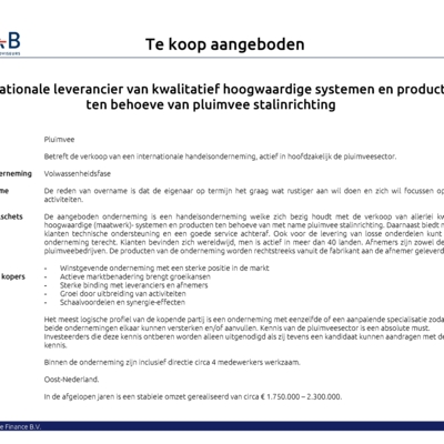 De aangeboden onderneming is een handelsonderneming welke zich bezig houdt met de verkoop van allerlei kwalitatief hoogwaardige (maatwerk)- systemen en producten ten behoeve van met name pluimvee stalinrichting. Daarnaast biedt men haar klanten technische ondersteuning en een goede service achteraf. Ook voor de levering van losse onderdelen kunt u bij de onderneming terecht. Klanten bevinden zich wereldwijd, men is actief in meer dan 40 landen.
